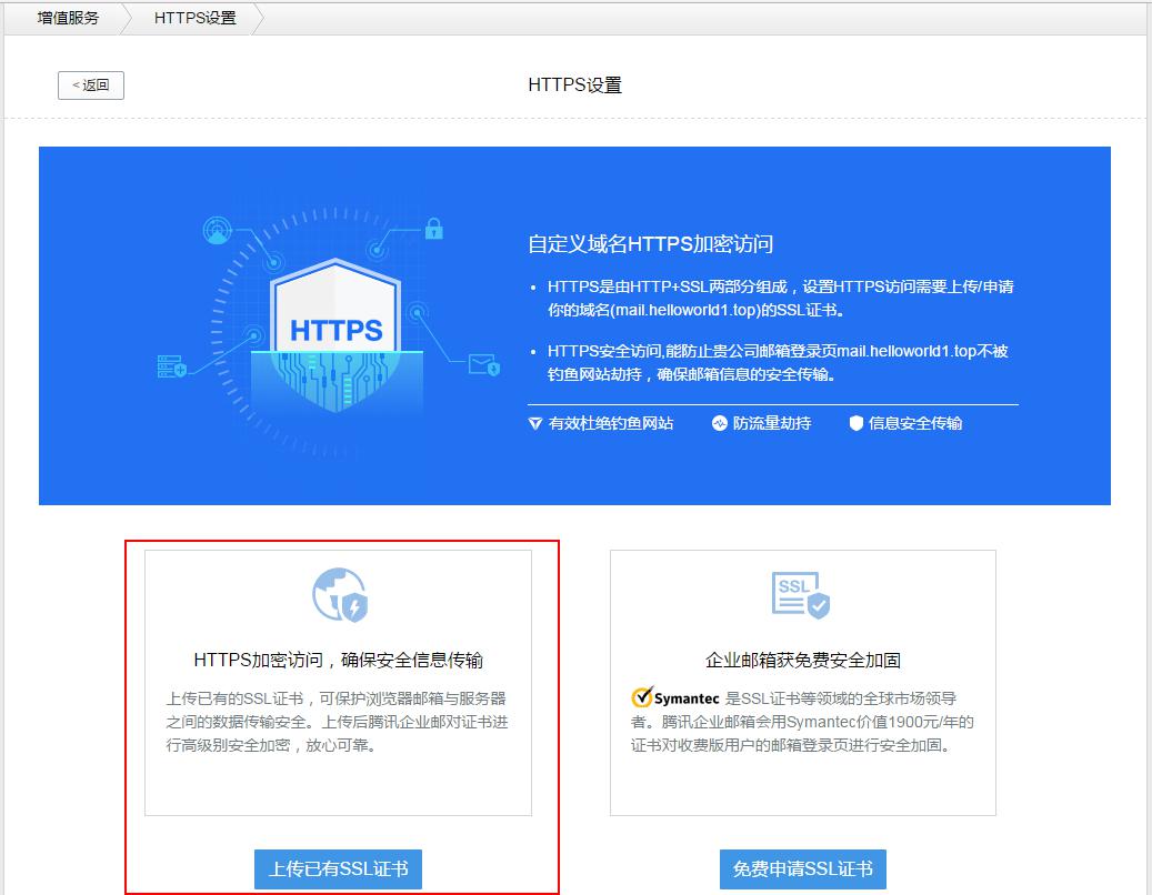 目前,腾讯企业邮收费版已经全面支持自定义域名的HTTPS加密访问,用户进入登录管理后台后,在增值功能处,就能找到入口,上传域名对应的SSL证书后即可进行设置。如果没有证书,只要进行申请,就可获得赛门铁克价值1900元/年的证书,免费为自定义域名进行安全加固。设置成功后,用户就可以使用HTTPS安全访问链接登录,在腾讯企业邮的登录页面上也可以看到相关的提示。