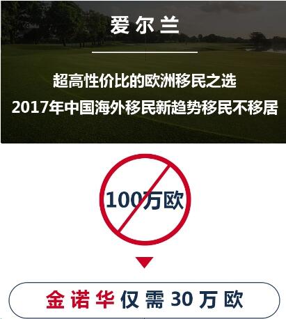 爱尔兰--超高性价的欧洲移民之选 1. 低投资,零风险:仅需30万欧元即可办理爱尔兰投资移民100万欧元项目,政府监管,资金透明,安全无风险。 2. 欧盟福利大国:福利待遇高居全球NO.11,超过美国、澳洲等福利大国,尽享欧盟高福利生活。 3. 欧盟护照通行全球:护照免签172个国家,永久自由出入欧盟。 4. 欧盟唯一英语大国:全球7大英语国之一,语言沟通无障碍,易融入。 5. 自然生态宜居:2010年被联合国评为最适宜人类居住的国家第五名。 6. 经济增速欧盟第一:人均GDP全球TOP24,2016年GDP增长7.8% 7. 顶级教育:教育体系欧洲排名第二,世界排名第四。 8. 企业税全球最低:企业税低至12.5%,苹果、微软等世界500强企业欧洲总部所在地。 9. 永久中立国:国家政策“永世中立”,安全,稳定。 金诺华独家爱尔兰最低价投资移民