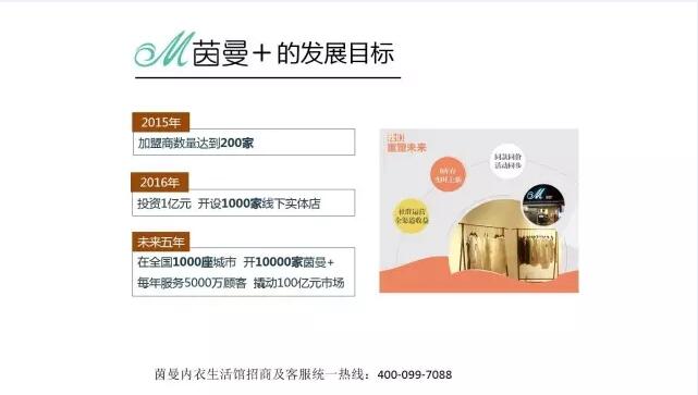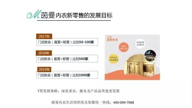 关于“茵儿内衣生活馆”的发展目标: 2017 门店数量(直营+联营)达到50-100家 2018 门店数量(直营+联营)达到500家 2019 门店数量(直营+联营)达到1000家 茵曼内衣生活馆招商及客服统一热线:400-099-7088,我们期待您的加入。 以下是演讲PPT干货实录: (温馨提示:可点击放大查看PPT图片内容)