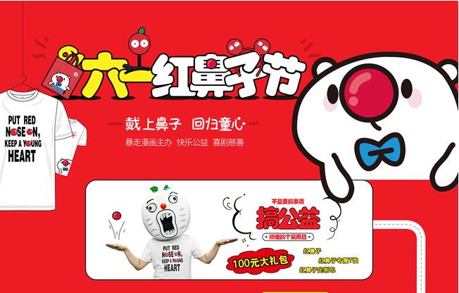 暴走漫画主办的“六一红鼻子节”,暴走漫画拥有“红鼻子节”品牌授权,2017年在中国策划并发起“六一红鼻子节”,联合各届小伙伴一起打造快乐公益品牌活动。“六一红鼻子节”通过4月到6月的活动旨在带动全民参与,用快乐的形式传递公益,帮助青少年健康成长,将“快乐公益,喜剧慈善”的概念传递给大家,并将在6.1晚上举办盛大的晚会,邀请各界艺人和大家一起用喜剧表演的形式,将活动推向高潮,打造中国持续发展的泛内容娱乐化的公益品牌。“六一红鼻子节”以娱乐的方式提倡快乐公益,活动收入按比例捐赠给“暴漫行动公益基金”。该专项基金由“暴走漫画”和“深圳市关爱行动公益基金会”联合设立,旨在帮助青少年健康成长。目前,“六一红鼻子节”的公益合作伙伴有免费午餐基金、美丽中国和西部阳光基金会。 |