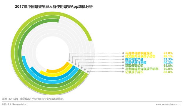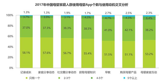 值得注意的是,以记录成长和家庭内分享动态为动机的用户专一度更高,该部分用户只有一个母婴App的比例分别达到58.1%和57.6%。而以早教和购买母婴产品为使用动机的母婴用户,只有一个母婴App的比例仅为51.5%和51.1%。