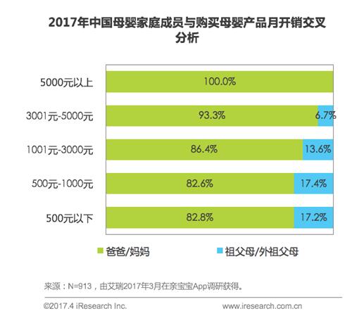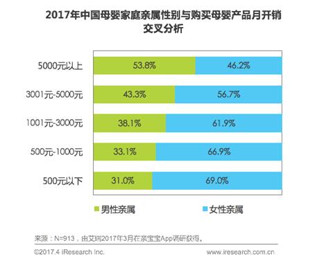祖父母们成母婴消费辅助力量,高额消费以男性亲属为主 虽然母婴家庭中,爸爸妈妈是购买母婴产品的主力军,占比达到80%以上,不过祖父母/外祖父母也成为母婴产品购买的辅助力量。在母婴产品月支出中,在500元以下、500元-1000元,1000元-3000元三档里,祖父母/外祖父母是消费主力军的比例都超过了10%。