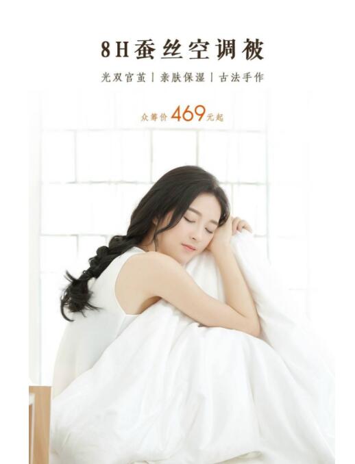 蚕丝被盖在身上相对于棉花被来讲要轻很多,适合不喜欢睡觉有重压感的人盖,会有睡在云朵中的感觉哦。 8H匠心出品,古法手作,100%光双宫茧蚕丝空调被登陆小米众筹咯 蚕丝被优点一:蚕丝被属于天然动物蛋白产品,更亲肤。 主要是蚕茧为天然蛋白长纤维,它不含杂质,尘埃,无静电,并具有防蛀,防霉的特点。100%桑蚕长丝的被子,是一种真正的绿色产品。