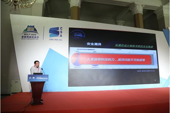 北京市公安局网络安全保卫总队党委委员副总队长胡蓉发表致辞 北京市网信办网络信息技术安全处副处长刘缨发表致辞 国家数字交换系统工程技术研究中心副所长兼总工程师季新生在发表题为《拟态安全》的演讲时提出:“网络空间安全的本质是3U问题,即未知漏洞、未知后门、未知攻击。人类目前的科技能力,漏洞问题不可能避免。”所以需要采用新安全技术,重夺网络安全战争的主动权。