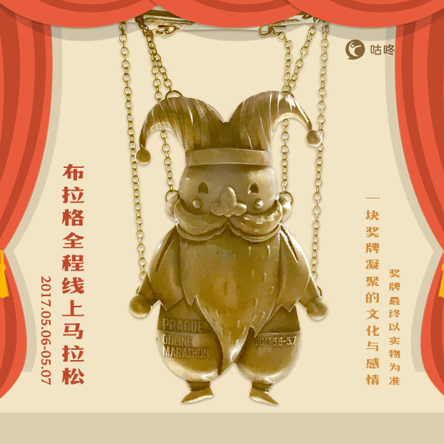 再也没有哪座城市,同时拥有罗马式、哥特式建筑,又融合了文艺复兴、巴洛克、洛可可、新古典主义、新艺术运动风格,甚至是立体派和超现代主义——只有布拉格,这座“金色城市”,带给跑者如同恋爱一般的激动和甜蜜。咕咚布拉格线上马拉松的主题“人约黄昏后”,为线上跑马带来了不一样的体验。 布拉格有着“世界木偶艺术”的别称,由于16世纪哈布斯堡王朝对捷克超过300年的残酷统治,试图以改变官方语言等摧残手段,让捷克本土文化消亡。热爱祖国的捷克人在民间偷偷用捷克语表演木偶剧,让孩子们谨记自己的母语。18世纪捷克再次复兴,木偶人成为布拉格乃至捷克人民的灵魂。线上马拉松的奖牌,设计灵感来源于提线木偶,身穿捷克传统服饰的木偶造型精美,还原出操纵木偶的丝线,为跑者演绎一段布拉格民间流传许久的童话。寓意纯真与美好的提线木偶奖牌,能够带给跑者浓烈的文化共鸣。