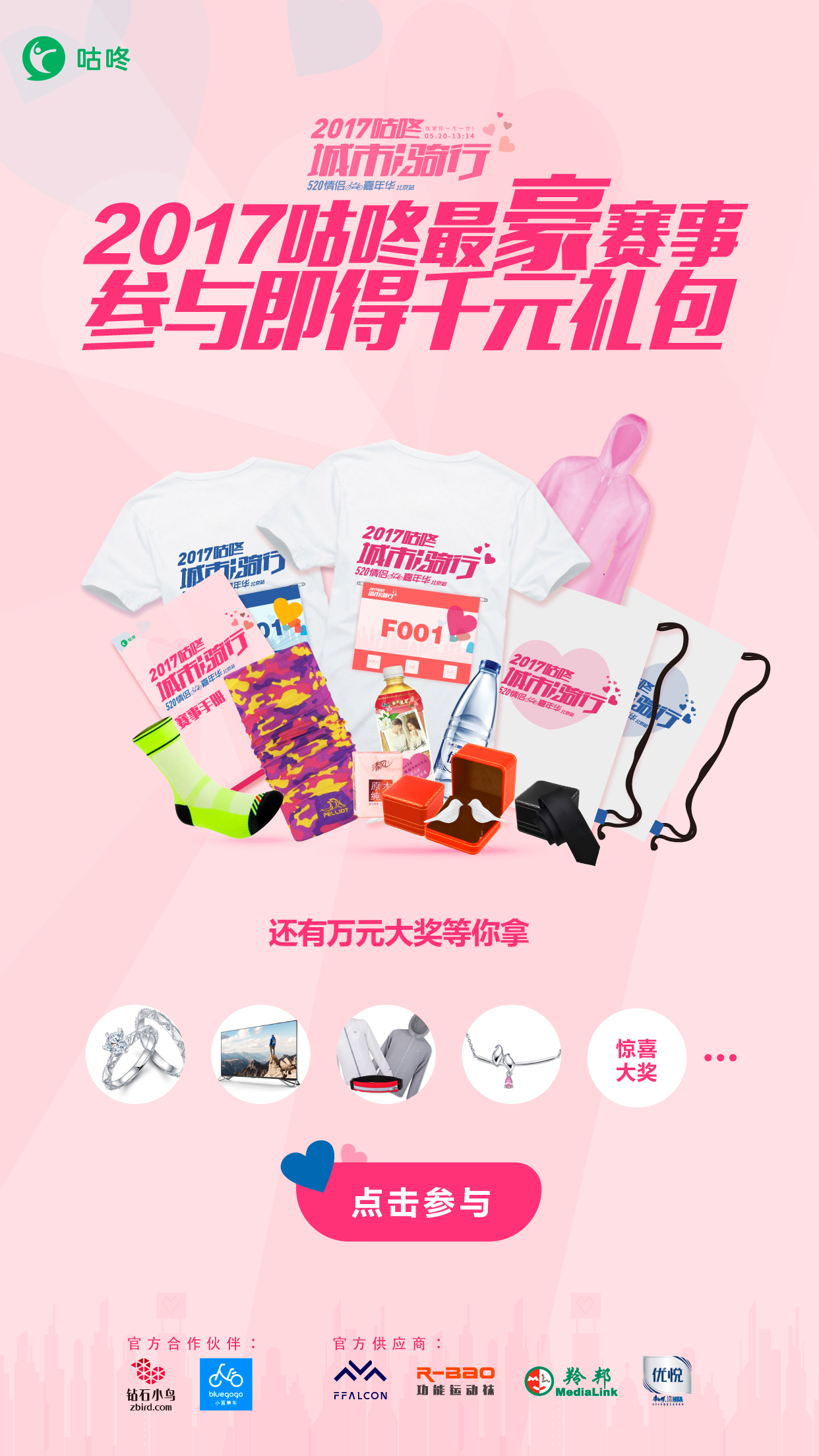 51已过,520还会远吗?一年一度的“520”就要到来,天气变得热情澎拜, 空气中也弥漫着爱的芬芳。相信不少朋友,早早开始计划520当天的活动,除了必不可少的吃饭看电影,送花送巧克力外,今年是否计划为心爱的TA来一场不一样的约会。 为了热恋中的情侣有一段难忘的回忆,咕咚为本次520策划了一场惊喜又浪漫的活动。5月20日,由咕咚主办的2017“城市i骑行”情侣骑行嘉年华将在永定河休闲森林公园举行。此次活动不仅设置多重比赛环节,为情侣间创造浓情蜜意的浪漫氛围,更准备了豪华大礼,让情侣们度过浪漫而惊喜的一天。
