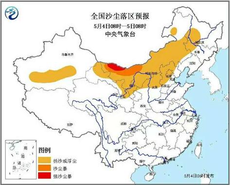 中央气象台5月4日06时发布蓝色预警:预计4日08时到5日08时,新疆南疆盆地、内蒙古中西部、甘肃中西部、宁夏、陕西北部、山西中北部、河北北部、北京、吉林西部和黑龙江西南部等地的部分地区将有扬沙或浮尘天气。其中,内蒙古中西部等地等部分地区将有沙尘暴,局地强沙尘暴。