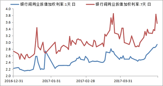 图表2:银行间同业拆借利率走势 数据来源:WIND,诺亚研究,数据截止2017年4月28日 监管有多严? 年初诺亚研究提到,去杠杆+金融防风险背景下,银行表外或为2017年监管重点,而近期监管动作无一得到验证,银监会两周内密集发布7个文件,其中6号文(《关于银行业风险防控工作的指导意见》)、46号文(《关于开展银行业“监管套利、空转套利、关联套利”专项治理的通知》)、53号文(《关于开展银行业“不当创新、不当交易、不当激励、不当收费”专项治理工作的通知》)等均剑指同业套利和同业扩张,涉及银行理财、存单和委外等业务,金融去杠杆继续。 主要涉及内容如下: 1)债券投资方面,债券投资产品杠杆设定上限,产品底层资产杠杆穿透,债券投资面临降杠杆; 2)理财业务方面,重申包括理财产品严控镶嵌、强化穿透管理、严控杠杆、不得使用自有资金购买本行理财、理财配置非标不得超过13年8号文的上限、自查是否违规开展理财资金池等,理财投资更具规范化; 3)同业业务方面,主要对同业存单和同业套利的监管,剑指监管套利、空转套利和关联套利,银行同业和委外业务面临收缩,底层流动性资产面临一定赎回压力,利空利率债; 4)信贷方面,房地产信贷趋严,地方债务严格管控,严格管理不良信贷出表,严格控制对“空壳企业”和“僵尸企业”的信贷。 此外,股市方面,4月证监会再次发声对于此前频遭炒作热捧的次新股表明态度,对于炒作行为将严厉监管打击。另有传言监管层开始注意区域游资炒股,有意严厉对待利用资金扰乱市场正常交易的行为。 资产配置的影响 目前货币政策继续侧重去杠杆、防风险,基本面目前表现相对稳定,汇率仍有隐忧但仍可控,短期来看,货币政策在量方面再难宽松,正如周小川“货币政策宽松已到周期尾部”发言。 目前市场风险偏好下降,主要在于监管的加码,后续或处于细节政策出台及现有政策落实执行阶段,预期风险仍持续一段时间。 债市方面 随着银行业严监管政策逐步落实,委外和同业资金的收紧引导金融被动去杠杆,资金链的收紧利空债市。短期来看,利率仍面临高位调整压力,难有单边趋势;长期来看,需关注金融防风险政策的边际变化、宏观经济指标和美联储加息节奏,美债利率走势对中国国债利率走势仍构成较大制约。此外,此轮货币市场和债券市场利率上行,企业面临再融资压力,目前企业发债利率上行100BP+,银行贷款利率和非标融资利率虽未见明显上行,但不排除有滞后效应,企业总体融资难度加大已成可见之势,预计高杠杆和短期债务压力大的中小企业信用风险加剧。 股市方面 诺亚研究认为近期A股市场下挫主要是由于政策面消息频出,监管加强造成的。监管政策下风险偏好下降对股市影响为短期效应,在有稳定经济基本面为支撑的前提下,A股市场不具备长期大幅下行的空间。此外,企业债务再融资的收紧,或加大部分上市公司的财务费用和资金链风险,预计个股盈利后续表现分化明显。 非标方面 根据相关政策,非标房企融资明显受限,此外信贷资金严控进入“两高一剩”、僵尸企业,结合再融资收紧情况,非标的信用风险加大,高杠杆和短期债务压力大的中小企业风险加剧,此外部分靠信贷维系的僵尸企业和中小产能过剩企业将风险暴露。 ——全文完——