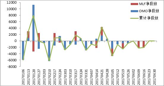 图表1: 2017年银行间资金量变化 数据来源:WIND,诺亚研究,数据截止2017年6月30日 自春节前后以来央妈陆续上调OMO、MLF、SLF工具利率,起压缩资金面、引导去杠杆作用。近期银行业严监管密集出台,直指同业套利和同业扩张,同业资金紧张加剧,银行间资金利率全面上行。