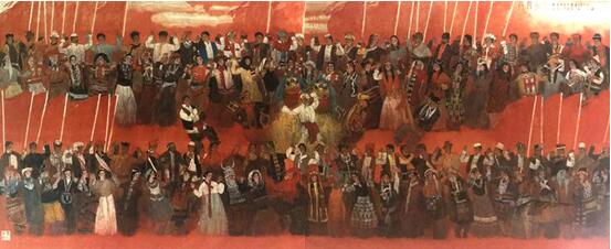共舞和谐 260cmx640cm 2011年 《高原画魂——高原画派一代宗师马西光》 作为一名生活在当代的艺术家,其成功的重要标志是其所创作的独特的艺术风格。早在20世纪80年代,中国画坛就涌进一股春光明媚的现代艺术思潮,多元化的文艺思想深入人心。在这样的背景下,马西光先生开始了其著名的“衰年变法”,他以一种优美奇绝的笔墨、以一种向内心开掘的气魄,直抵西北——这片雪域高原的精神层面,当之无愧地成为高原画派一代宗师。