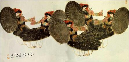 《江南风情》 96×96cm 2005年 他的作品素材采撷于真实的自然,而他的笔触透过了自然,伸向了人物的内心,注重对人物的内心进行开掘,进行诗性的放大。他着力于用情景交融的手法,折射出人物曲折幽深的精神世界,表现出人在不同的环境下的不同状态,从而使现实生活得到最大程度的诗意化,哲理化的延伸。其画外之致、象外之意很是惹人玩味,时而给人一种浮生若梦的幻觉,时而给人一种时光倒置的错觉,只觉得某种气息如影随形,且歌且吟,吸引你去探寻、挖掘。这是马西光作品里非常动人的一点。他的画很有味道,很有色彩,很有气度,很有分量,文学的通感在他的笔下变得那么可触可感,他让粗狂豪迈的高原,传达出梦一般的神秘、雾一般的迷蒙、月一般的柔美。在《水乡月夜》里,挑担的女子与身边行走的耗牛,悠悠的踩在独木桥上,完全融化在夜的蔚蓝色光芒之中。《草原之舞》,那墨团、笔痕的微妙变化,稚拙的人物造型,风中舞动的丝带,犹如一支曼妙的草原舞曲令人遐想;《草原铁流》,浓重的墨块、富有节奏感的线条,又让人顿生信马由缰、策马奔腾的快意。《湖水粼粼》,墨色交织的波光中,白衣女子优美的一个舞蹈姿势,在圣洁的雪域高原上,空灵而无声地绽放出一种迷人的繁盛景象,体现出一种充溢于自然与心灵,时间与空间之间的生命大美。马西光先生在吸取传统精髓的基础上,感悟天地之造化,极尽技法表现之能事,启示着艺术之道,他敏感而直率的视角似乎能看透事物所蕴藏的全部意义,从而提炼出事物之魂,撼动人心。