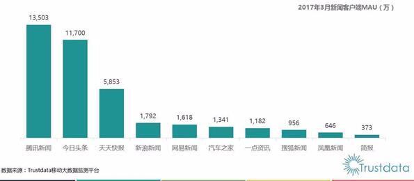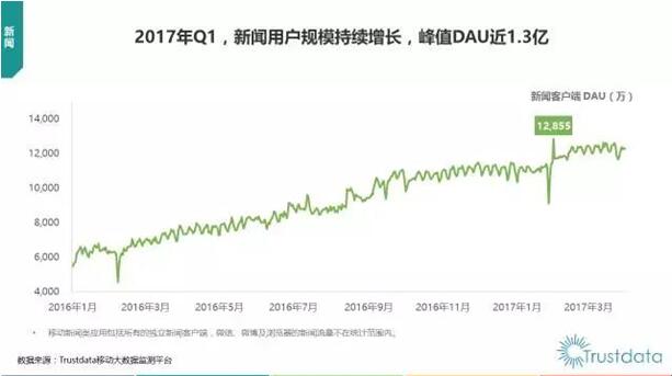 近日,Trustadata移动大数据监测平台发布《季度总结:2017年Q1中国互联网行业发展分析报告》。报告显示,新闻用户规模持续增长,峰值DAU近1.3亿,腾讯系移动新闻产品在其中贡献突出。