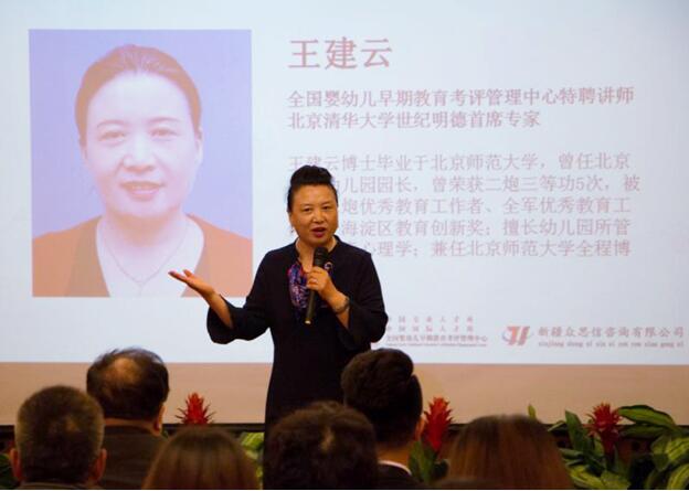 学前教育领域的资深专家王建云博士做分享 王建云老师强调,家庭教育是其他一切教育的基础。孩子在 0~6 岁阶段,除了上幼儿园,大部分时间都是与父母相处,父母的言谈举止无时不刻不在潜移默化 的影响和塑造着孩子。只有提升父母的家庭教育水准,才能让孩子在孩童时期为一生的发展打下坚实的基础。随后,王建云老师围绕家庭教育方式,分享了许多专业的经验和教育理念,给当地的早教从业者们带来了崭新的思路和启发。王老师指出,提升父母家庭教育能力是提升早教质量的重要保障,对此,父母应该引起足够的重视,在送孩子上早教班的同时,选择合适的途径进行自身家教技能的提升。 紧接着, 来自全国婴幼儿考评管理中心的金牌讲师吴雯老师,向新疆地区的业内 同仁介绍了早幼教一体化新型教育模式。早幼教一体化教育模式,是在保留幼儿园原有教学体系的基础上,增设了早教课程、兴趣课程和父母成长课程,三门课程分别面向0~3岁宝宝、3~6岁宝宝以及0~6岁宝宝的父母。