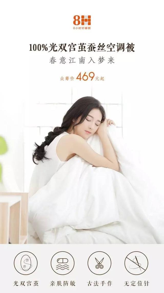 民国第一夫人宋美龄一生,一刻也没有离开过真丝衣服和真丝床品,她说:寝具和衣服非真丝不可。1943年入住白宫时,她还特意嘱咐接待人员将寝具换成真丝床品。 如果你还要问蚕丝到底好在哪里,为什么能令名流志仕成为它的疯狂粉丝?小编再给你细讲一下它的优点。 1柔顺亲肤 蚕丝的密度小,轻柔如丝,给你带来的是“柔若无物”的感觉。身心疲惫的时刻,除去衣物的束缚,在“第二肌肤”的蚕丝中睡一个美容觉,享受身心放松的奢侈。 2吸湿恒温 蚕丝有亲水侧氨基酸,吸湿力是棉的1.5倍,通过纤维细小的孔进行温度调节的作用,拥有“冬暖夏凉”的特性,使人不易踢被。 3防螨防霉 蚕丝外面有丝胶,对螨虫、微生物等有抵御作用,所以蚕丝具有极佳的防霉、抗菌的天然特性。 好眠难得,一个细腻、柔软、温情的好眠更难得。在这个浮躁的社会,不该辜负自然界馈赠的美丽之丝,选一袭华美真丝被子安抚你疲惫的身躯。 8H蚕丝被,用精致高贵的方式保护你每一个好眠。