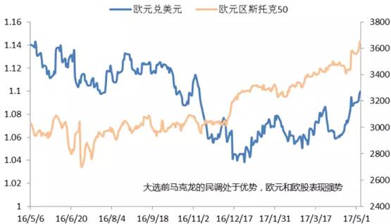 资料来源:诺亚研究整理 从目前来看,无论是欧洲市场还是欧洲政界,有关欧洲大陆将摆脱近10年危机的期望正在迅速升温。在法国大选传来利好消息的同时,近期欧洲经济也开始展现出强劲的复苏势头。在这一背景下,投资者认为欧洲最大的麻烦已经过去,市场显然已经在押注欧洲不会出现导致欧元或者欧盟崩盘的黑天鹅事件。 · 欧洲:短期内大选年对欧盟一体化的冲击消散。 马克龙的顺利当选为动荡的欧盟局势打了一针缓冲针,作为坚定的“亲欧派”,马克龙虽然因反对法国政坛左右壁垒分明的政治格局被媒体称为“反体制”人物,但他支持欧盟组织建设的主张同传统政党的主张一脉相承。虽然马克龙与传统政党在很多方面政见不一,但是相比于极右的勒庞,欧盟显然更欢迎马克龙当选。这会促使投资者回归基本面,去思考经济基本面及其对货币政策的影响。鉴于欧洲资产价格的扭曲程度,市场仍存在很大的调整空间。 · 欧元:带来阶段性上涨的动力。 马克龙的一些列政策有助于欧盟政治版图的稳固,欧元将出现小幅度的升值,但是之后仍受制于欧洲后续大选结果及英国退欧的进程,难言持续。其他资产类别表现类似,欧洲股票市场权益类资产相继上涨,美元下跌,法国与德国国债收益率差缩窄。但之后市场将会恢复平静,消化后续的新消息。