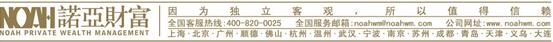 【关于诺亚】 诺亚控股有限公司(NOAH. NYSE)起源于2003年,2010年11月10日成功登陆美国纽约证券交易所,是中国内地首家上市的独立财富管理机构,独立财富管理行业领军者。 公司定位于新一代综合金融服务提供商,目前,形成资产管理、财富管理、全球开放的产品平台、互联网金融四条业务主线,覆盖家族财富管理、高端财富管理、海外财富管理、保险经纪、高端教育等业务领域,综合金融服务集团架构成型,总体上具备为中国高净值人士实现全球化、全面资产配置服务的能力。 截至2016年12月31日,诺亚财富已在上海、北京、广州、深圳、温州、杭州、重庆、成都、西安、青岛等71个城市设有185分支机构,为超过13.5万名高净值人士提供综合金融服务。 【免责申明】 本信息均来源于公开资料,诺亚力求内容的客观、公正,但文中的观点、结论和建议仅供参考,不代表任何确定性的判断。诺亚并不保证其准确性、完整性、实时性或正确性。投资者据此做出的任何投资决策与本公司和作者无关。 本稿件相关知识产权归诺亚控股有限公司及其关联公司所有,未经诺亚控股有限公司及其关联公司许可,任何个人或组织均不得将本稿件内容以转载、复制、编辑、上传或发布等任何形式使用于任何场合。如引用、刊发请务必注明出处为诺亚财富集团,且不得对本稿件进行有悖原意的引用、删节和修改。诺亚控股有限公司及其关联公司保留追究侵权者法律责任之权利。