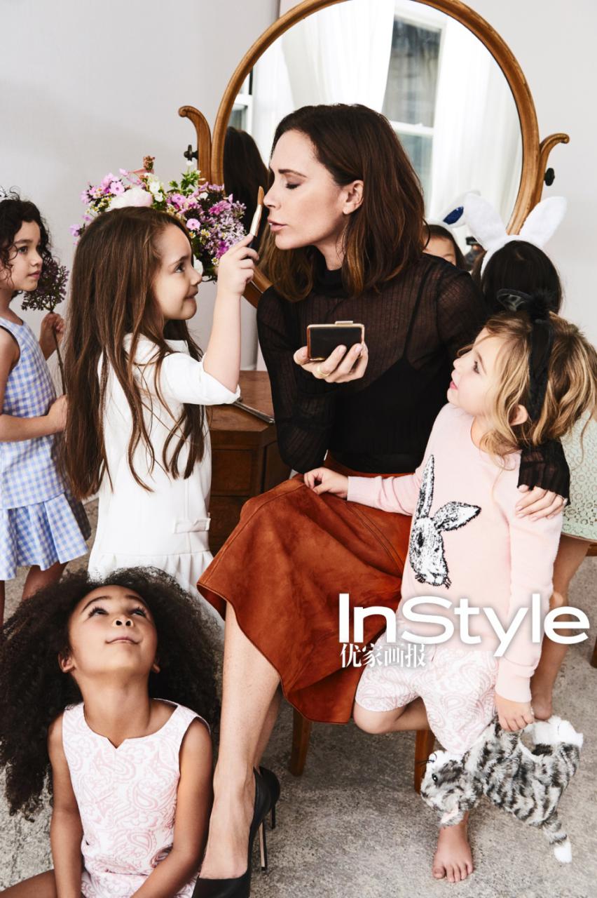 Prada 条纹衬衫和毛织短裤,prada.com Manaolo Blahnik 绒面高跟鞋 (贝嫂手上及地上),manoloblahnik.com Sergio Rossi 红色绒面高跟鞋(地上),sergiorossi.com Dior 漆光牛皮平底鞋(地上),dior.cn,400-122-6622 Victoria Beckham for Target 所有女童模特:全套服饰、发带、毛绒玩具、道具,target.com 我的品牌就是我的第五个孩子 Target百货 的消费者调查显示,贝嫂在 Target 的众多合作设计师里受消费者认可度排名第一,购物者最常用来形容她的词是“时尚偶像”、“贤妻”和“母亲”。这款系列包括时装和贝嫂首次尝试的童装。她对该系列的设计灵感源自于她的另一个更加活泼的 Victoria Beckham 系列,这个系列是五年前她怀上小七的时候推出的。这也更加揭示了贝嫂的真实身份—一位尽职尽责的母亲—而不是博取热点的新闻人物。 “你确实理解了我和小七之间的关系,”她一边指着碎花印图,一边说道,这让她想起了周末在伦敦荷兰公园和小七一起散步的时光,还有她们平时喜欢在一起玩的贴纸书,“所有事情都那么有趣、简单、可爱。我无论何时何地都会真实地表达我的想法,这就是我。” 我突然感到好奇,她和丈夫有没有幻想过孩子们全都长大后,他们的生活会变成怎样。布鲁克林正在挑选大学,也包括一些美国的大学。“我不太确定他到时候会从事什么,”她说,“但希望我们的关系会一直像现在这样亲密。”几年前,贝嫂曾说自己和丈夫想要再生一个孩子,但如今她却说自己不会再有第五个孩子了。“四个孩子已经够多了,而且他们每个人都非常棒,”贝嫂说,“我的品牌就是我的第五个孩子。” 供稿by Eric Wilson 摄影by Pamela Hanson 发型:Orlando Pita来自Art+Commerce 妆容:Fulvia Farolfi 来自Bryan Bantry Agency 指甲:Jin Soon Choi 来自 Jed Root 内景布置:Matt Jackson 来自 The Magnet Agency 编辑/Nata.W 设计/杨晓蔚 |
