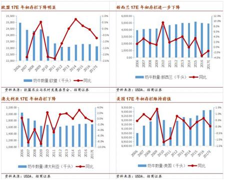 有观点认为,受新西兰、澳大利亚、欧盟、美国等主产国持续去产能,中国、俄罗斯等进口大国乳品市场需求恢复,主产国气候疫病等非主观减产等因素的影响,预计全球奶价仍将稳步攀升,并在2018年出现奶价高点。 在主产国去产能方面,在四大主产国存栏今年年初呈下降趋势的情况下,2017年全球原奶缩产趋势确立,主产国主动持续去产能将是奶价上涨的基本动力。实际上,从2016年4季度开始的此轮奶价周期筑底回升的主要原因就是供给端一致缩产调整的结果。 图2:四大主产国存栏量下降明显