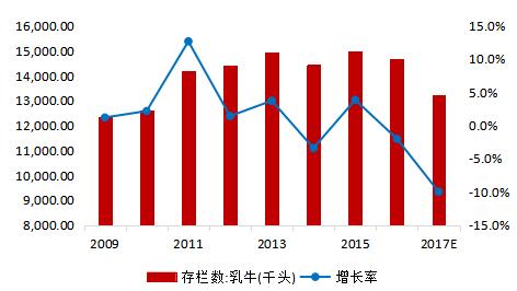 另外,随着中国在国内宏观经济调整逐步完成,同时三四线及以下城市乳品习惯性消费逐步养成,以及2015年以来全面二胎开放带来的人口红利全面显现,中国终端消费预计在2018年左右将全面改善;俄罗斯方面,随着和欧盟政治关系的改善,在2017年禁运结束后可能不再延长对欧盟制裁周期,如果禁运政策不延期也就意味着俄罗斯2018年乳制品进口需求将出现大幅反弹。 国际奶价上涨对国内奶牛养殖企业来说无疑是重大利好。随着GDT全脂奶粉近月暴涨,在今年1月17日拍卖中涨至3283美元/吨,进口完税价格换算成生鲜乳价格已达约3.38元/kg,算上运费,进口乳粉当前价位优势已不再。在这种情况下,国内下游乳制品企业将会更倾向于向国内奶牛养殖企业采购生鲜乳。 另外,中国奶牛养殖业在15和16年奶价低迷状态下“倒奶宰牛”导致大量养殖户退出,2017年存栏预计将继续下降,产能缩减的趋势继续确立,供给端进一步缩产调整将支撑奶价短期内缓慢上涨。