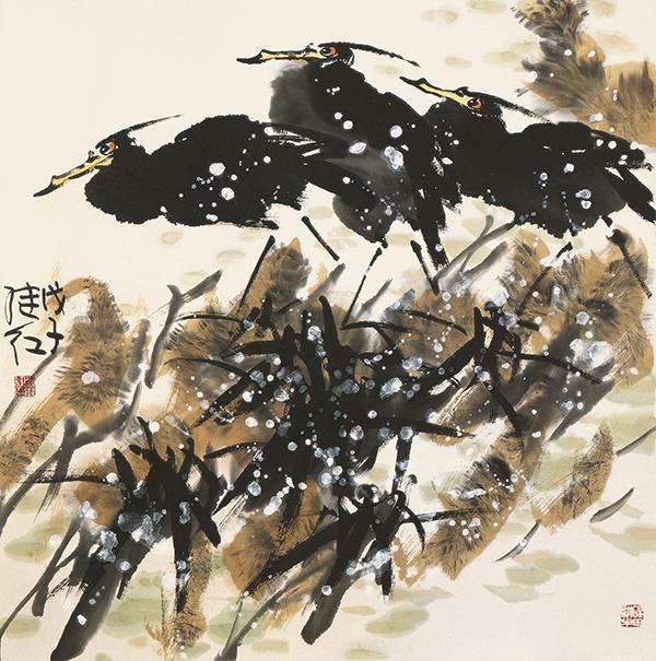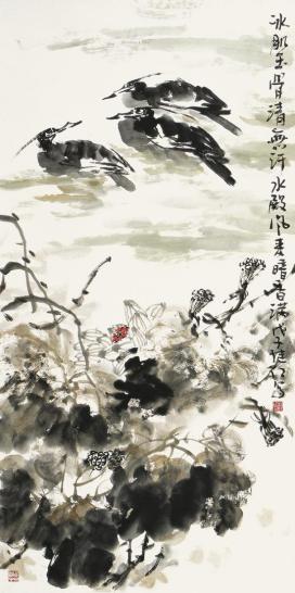 芦荡鸣禽 正是在这样的情景下,我读了刘继红近年创作的一批大写意花鸟作品。令人振奋的是,他的大写意花鸟落墨为格,清新刚健、风姿绰约、野逸放达、既有骨力,又见墨韵风神,在激情四溢中喷发出一种不同寻常的阳刚之气。他笔下的八哥、双鹭、翠鸟、锦鸡、芦雁、鳜鱼以及牡丹、玉兰、荷花、秋菊、枇杷、石榴、杜鹃、紫藤等等花鸟,无不以精炼的笔墨,通过对水和墨的干湿浓淡变化的恰当把握,生意盎然的涂抹出物象的形态、神气、质感、量感、空间感、又极富画家主观的意趣、情致、韵味、心态。他们不似自然中的此花此鸟,但又完全符合当代人心目中的审美理想;不是具象,也不是抽象,而是“物我交融”、“天人合一”的意象造型,承古意多有新变。令人赏心悦目。