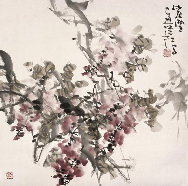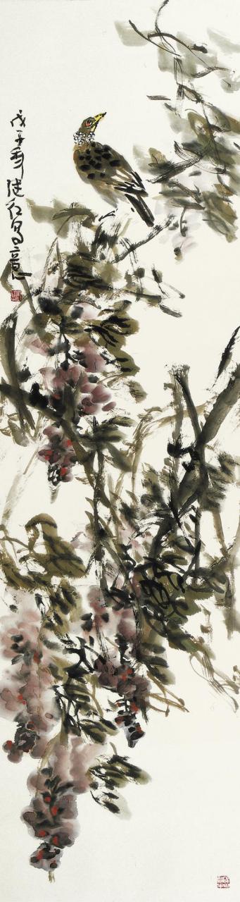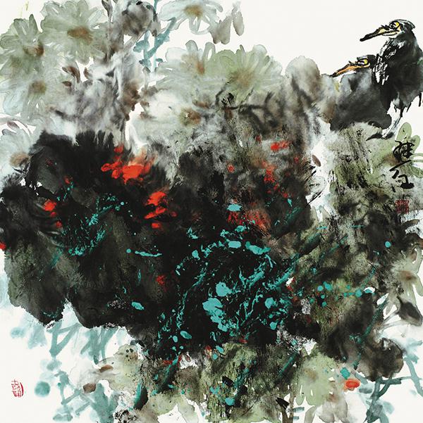 野趣 虽然,刘继红表现的题材都在传统绘画中所常见,但是一种特定的艺术样式必定要随着时代的推移、更新而发生变化,这个道理始终萦绕在他的脑际。解读他的作品,我们发现,画家始终以线为画面的基本结构,随着图式得需要与表现对象的形态及情境的不同,而变换着线的形态、样式与节奏。粗粗细细、浓浓淡淡、虚虚实实、疏疏密密、或点或线、或勾或皴、或断或连,互相交织在一起,看似无序却有序,在不经意中被组织为枝、叶、花、草、鱼、鸟的千姿百态;而笔中有墨、墨中有笔,加上中锋、侧锋、逆笔、顺笔、枯笔、湿笔与泼墨、积墨的多重变化所形成的笔痕墨迹之美。达到实与虚写的互补、浑然的效果。骨力雄强、泼辣、苍劲、酣畅;水晕墨彰,丰厚、华滋、灵动,处处体现出画家的主观创造性,注入了个人的审美感受和体验,并体现出一旦进入创作状态,画家的想象力的自由发挥与创造力的不可遏止。更为重要的是或俗或雅地格调,是或聚或散的情意,是体现在作品里的“画外之意”与“境外之思”。刘继红的创造性在于已变写小情小趣为构筑蓬勃丰茂之境,画花卉禽鸟之美也不囿于一花一鸟之丽,而能够在长天大野中表现强悍瑰伟的奇情。那种整体得大开大合,细节的错落穿插,乃至每一个花瓣、每一组叶子、每一对禽鸟的映与衬、藏与露、俯与仰、顾与盼都达到了自然天成而毫无雕凿之迹。这种似乎旨在摆脱城市噪声与环境污染的情怀与旨趣,是他拥抱新的时代、新的生活的热情,是他和大自然物我交融升华的灵魂。
