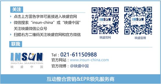 作为国内一线互动整合营销与EPR领先服务商,映盛中国自创立以来,一直秉承以客户的需求为第一要素,运用资源和技术平台的优化整合,高效且精准的为客户定位传播市场,真正为广大广告主创造更丰富精彩的互动体验。未来,映盛中国仍然将通过优化全网解决方案,结合优质全媒体资源,为广告主提供基于全网和全媒体的一站式整合营销服务,在“互联网+”的时代里,成为广告主整合营销传播的强大引擎! 映盛中国(INSUN CHINA),作为最早涉足互联网营销的专业服务商,在互联网互动整合营销和移动营销领域拥有强大实力和卓越口碑,立足于多套自主开发专利技术的互联网营销与网络公关执行分析系统矩阵,为客户提供:互联网互动整合营销规划与执行,互联网公共关系(EPR),社会化媒体营销策略制定与实现,移动营销策略制定与执行,互联网舆情定制化解决方案&分析报告,以及快速实现销售线索或品牌效应增长的各类整合营销服务组合。