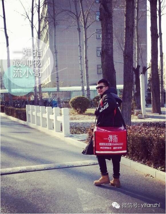 一弹指配送小哥图 一弹指是我国第一家提出"45分钟限时送达、超时免单"的O2O商超,据一弹指创始人周健介绍,一弹指深耕高校市场,之前主要市场在昌平的高校区,这次进军央传,是在商业模式打磨成熟、得到检验后,向市区扩张的第一步。