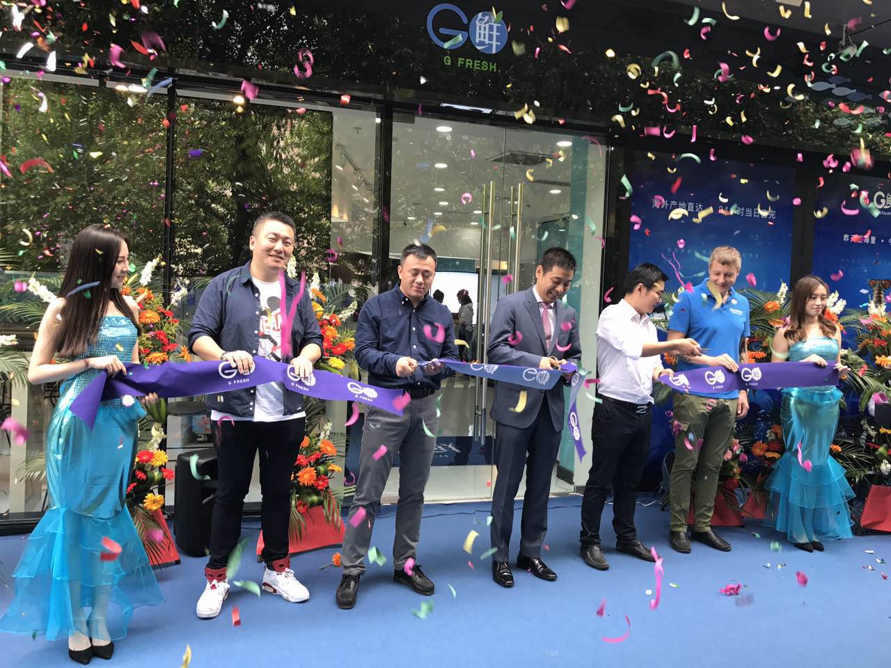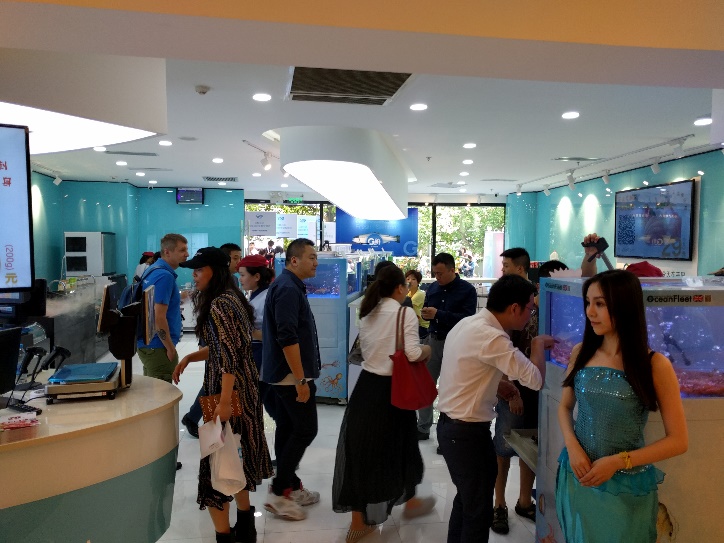 G鲜小店开业现场以蓝色大海为主题,以海洋为背景,采用各种海产品元素与G鲜产品结合,还有衣着美人鱼服饰的礼仪小姐穿梭其中,大家宛如置身海洋之中,为现场顾客打造一场视觉盛宴。