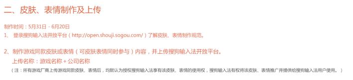 游戏同款,开放平台迎来皮肤表情盛宴 “最酷皮肤表情”评选活动以搜狗输入法皮肤表情开放平台为依托,是开放平台上线后的又一重点活动。自上线以来,平台受到了全国优秀设计师的热捧,许多大IP、草根及原创IP积极参与,大量优秀作品涌现,获得众多网友青睐。开放平台促进了原创内容生态圈的进一步优化。 在平台效用持续发酵的过程中,搜狗输入法与China Joy强强联手,重磅推出“最酷皮肤表情”评选活动。游戏同款皮肤、表情将形成强大阵营入驻平台,势必在游戏圈刮起一阵旋风。无论对网友还是对平台来说,这都将是一场游戏界的饕餮盛宴。 此次活动,China Joy所有游戏厂商均可参与其中。厂商制作自己的输入法皮肤或表情,上传至搜狗输入法开放平台,即有机会获得在搜狗输入法亿万用户中一展风采的良机。搜狗输入法将以最优质的资源对评选获胜的作品进行大力推广,同时搜狗输入法还会提供一笔价值不菲的推广奖励。 目前,活动的报名工作正在火热进行,于5月26日报名截止。现在已有多家游戏厂商报名,参与了本次活动。游戏厂商将相关信息发送至指定邮箱,领取参与ID及密码后即可参与活动,同一厂商可进行多款游戏的报名。随后,厂商需登录搜狗输入法开放平台,制作并上传游戏同款作品。用户投票评选的TOP3即可获得奖励。
