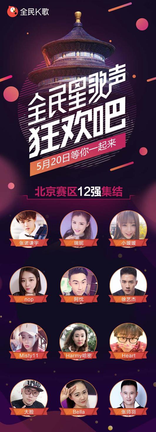 5月20日晚,由全民K歌主办的2017“全民星歌声”北京区决赛在狂飙乐园正式拉开帷幕,12强选手齐聚北京尽展歌喉。此次比赛也创新性地通过线上全民K歌直播平台和线下评委的综合打分,由百万网友和现场观众见证,选拔出了北京赛区三强Heart、张诺谦宇和Nop。