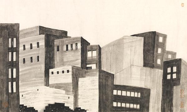 更为难得的是马波生的当代都市水墨中所含有的古意,即,“从来多古意,临眺独踌躇”的那种情调。唐代杜甫在《登兖州城楼》时得到的这个诗句,而马波生却是在临眺博物馆的大量古代绘画作品收藏时研习的结果,或者是博习古今名人笔墨的收获,更可能是李可染传派的特点。在马波生的水墨画中,我们在强烈的、扑面而来的当代热浪之后所体味到的是龚贤(1618-1689)积墨法的浓郁,法若真(1613-1696)柔绵中透明的墨色,弘仁(1610-1664)刚拔峻峭的线条的综合特点。