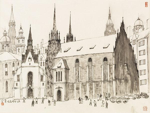 谈到都市水墨画的渊源,我联想到李可染先生五十年代的一幅作于他访问东德时的写生。这件写生作品虽然开以建筑物为主的先河,但是仍然半隐半现在树丛之中,仍然在很大的程度上保持了传统山林文化和西方景物的结合。而马波生的都市水墨画中完全背离山林文化,他的画中的森林是水泥建筑,树的枝杈是纵横交错的电线,活动在这森林间的是熙熙攘攘的当代忙碌而相互陌生的人群以及当代交通工具。故此,马波生从一个摩习李可染的山林水墨传承的学生升华而为携持李可染的文化精神进入了当代的都市化文化时期文化。与此同时马波生另外开拓了原本空白视觉审美空间—都市水墨文化空间。从这个意义上说,对马波生的都市水墨艺术的研究因该放置在中国都市文化研究与中国文学学科的学术框架中,整体地讨论当代视觉文化在都市化影响下出现的嬗变。