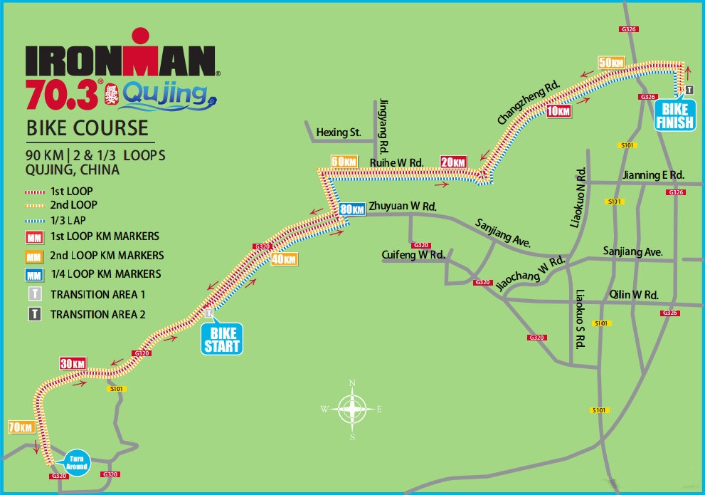 小结:优质的水源、相对平静的泳道再加上适宜的温度,整体而言,在这里进行游泳比赛对于选手们来说没有太大难度和挑战,但部分选手还是要警惕高海拔所带来的影响。 骑行赛段颇具挑战 赛前可进行赛道模拟 游泳起水后,选手将会在湖边进行换项,然后沿320国道下行,向东进入曲靖城区开始自行车比赛。如下图所示,BIKE START为自行车赛道出发点,首先向右上行至BIKE FINISH点,然后从BIKE FINISH到左下角TURN AROUND处进行两个往返,最后在BIKE FINISH处结束自行车赛段的比赛。整个骑行赛道累计90公里。