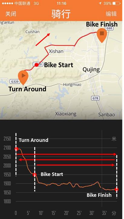 IRONMAN官方自行车赛道图 对于曲靖的自行车比赛赛段,巴斯坦言,赛道的高海拔以及爬升的高度,都给选手带来不小的挑战。据官方详细数据显示:曲靖骑行赛道最高海拔可达2094米,自行车赛段总爬升1128米,爬升路段累计长度为18公里。 如下图所示,选手们从海拔高度为1950米的红点处出发,紧接着就是几个连续的下坡,尽管此处起伏的幅度并不大,但由于比赛中连续起伏及间歇爬坡较为密集,因此对于选手的体能消耗还是很大。 整条赛道最具挑战的地方还属一处平均坡度4%,长达7公里的连续爬升路段,如下图中BIKE START至TURN AROUND处。路线长、坡度较大,这些都给选手带来一定的困难。相比游泳、跑步两项,自行车算是其中最具挑战性的。