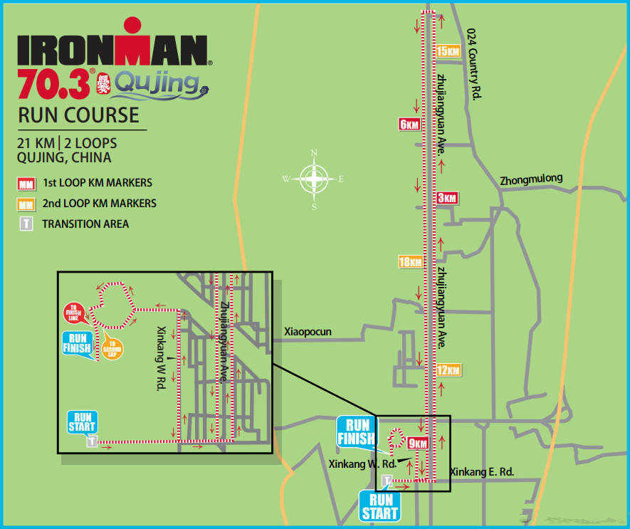 宽敞的自行车赛道 小结:自行车赛道的连续起伏以及爬升的高海拔都会带来不小的挑战,参赛选手赛前可选择相似赛道进行模拟。 跑步赛段体验新鲜 路旁风景迷人 结束骑行赛后,选手将在位于曲靖文体公园的T2换项区进行换项,进入最后的跑步赛段。如下图所示,从最下方的RUN START开始,沿红色虚线绕行一圈,在RUN FINISH处结束所有的比赛。共计21公里。