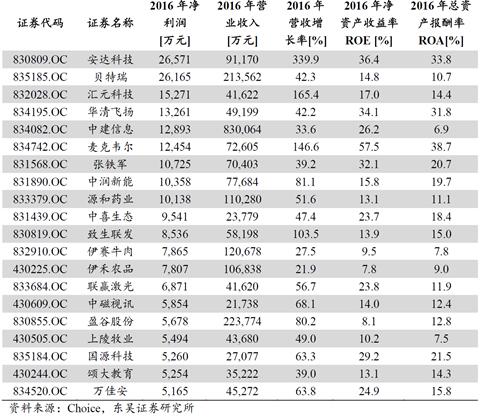 尽管如此,新三板创新层还是存在少数非常优质的公司。普遍认为,同时符合创新层三条准入标准的“三好学生”是创新层优质企业,而连续两年的“三好学生”则可以称得上是优中选优的企业。实际上,去年创新层21家“三好学生”中,今年又符合三个创新层维持标准的企业非常少,仅有上陵牧业(430505)、联赢激光(833684)、致生联发(830819)、颂大教育(430244)等少数几家。 表2:同时符合三个创新层维持标准的前20 家企业(按净利润排序)