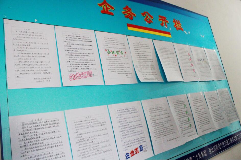 通让二工区工会乘着东风组织了《企业宣言》书写比赛。大伙热情高涨,有部分拿出办手抄报的看家本领极其用心的排版书写;多数劳务工也积极踊跃参加;现场组的技术员常磊、毛鹏辉、现场负责人逯登平忙里偷闲也交了“胜利果实”。工会干部挑选精美、规范书写张贴。张贴后的围观不亚于工资公开。与此同时,工会给每一位参与者发放纪念品以资鼓励。