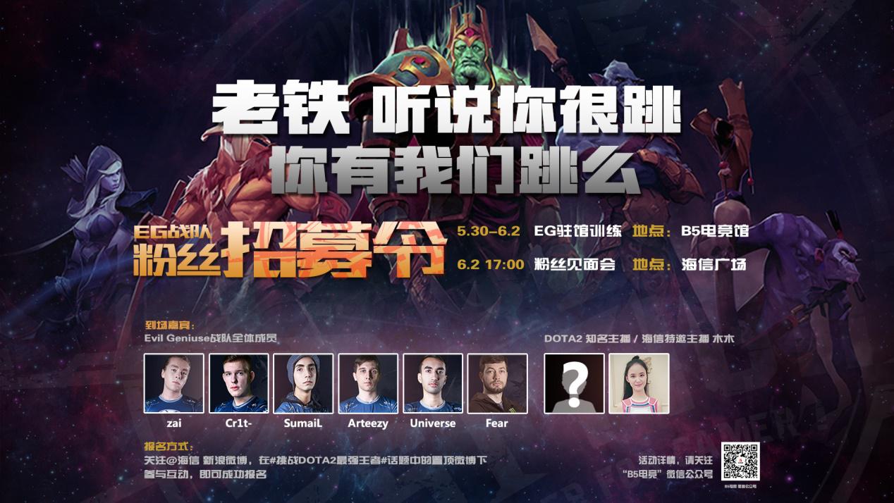 B5电竞馆EG战队粉丝招募令 本次EG战队中国行还将会有粉丝见面会和水友赛两个环节,欢迎各位水友前来目睹世界冠军风采,亦或和他们来一场酣畅淋漓的对决。如此机会摆在面前,相信DOTA2忠实玩家们一定不会错过! B5电竞馆青岛店地址:青岛市崂山区海口路33号麦岛家园18号楼3层 【关于B5电竞馆】