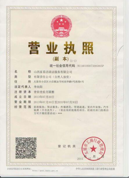 公司介绍 企业简介:山西家易洁清洁服务有限公司是太原市工商行政管理局批准成立的(注册资本为人民币110万元),集管道疏通、清理化粪池、清洗外墙、清洗抽油烟机、开荒清洁、清洗地毯、石材翻新、打蜡抛光、物业保洁、室内外装修、汽车装潢为一体的多功能专业型室内外清洁环保企业。为了提高清洁服务质量,环境管理水平和员工的环保意识,实施质量第一,品牌战略的现代企业经营理念。 公司始终把质量和信誉作为公司一切工作的前提,把“以质量求生存、以信誉求发展”作为公司经营宗旨,把“最大限度地满足客户的需求”作为公司追求的目标。 公司业务部门 1、石材部,专业的团队、专业的设备,保证一流的品质。2、保洁部,单位、小区、酒店、学校、商场,我们无处不在。3、家政服务部,针对高端客户群体,提供全方位优质的服务。 服务介绍 大理石翻新护理、物业保洁、大型工程开荒保洁、办公楼保洁、各类清洗服务、各类打蜡保养服务 联系我们 地址:太原市小店区嘉节村