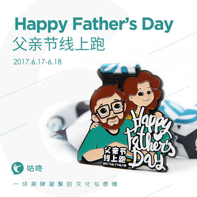 咕咚父亲节线上跑的奖牌,以父女情深为设计题材,奖牌正面一层层上色,以生动的表情,表达了“我的男神是爸爸”的温柔情感。奖牌字样线条流畅,“每次骑在他的肩上,我就像是看到了整个宇宙……”没错,这是一枚被时光定格的父女相片,长大成人的女儿,依然渴望爸爸坚实的后背带来的安全感,不管时光如何改变,女儿心中那个无所不能的“超能英雄”永远会给她温暖的拥抱。