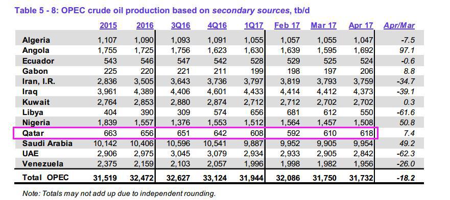 导读:昨天,卡塔尔与沙特等国的断交事件给原本就已经纠结的要死的原油市场再添一道堵。众所周知,当今的原油已早已在商品属性后面又添加了两个标签:金融属性&政治博弈,原油价格后面如何演绎更大程度上仍然取决于各方的博弈,也理应遵循一定的逻辑路径,诺亚研究希望从原油的供给端谈谈可能的一些路径与思考。 【被“嫌弃”的卡塔尔】 在这里并不去探讨卡塔尔为什么被多国“嫌弃”,先不谈政治。我们从金融的角度去看看已发生的事件反馈之后的效果。首先,先通过下面的图表来看下卡塔尔在产油国中的地位。 图表:OPEC各国原油产出情况