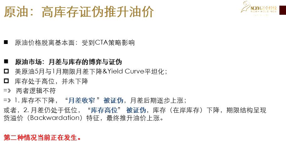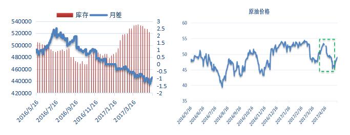 数据来源:诺亚研究2017年下半年投策报告 月差仍处于低位,“库存高位” 被证伪,库存(在岸库存)下降,期限结构呈现货溢价(Backwardation)特征,最终推升油价上涨。