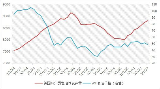 数据来源:Bloomberg,诺亚研究 【纠结1:OPEC国家与俄罗斯减产预期及执行情况】 这一个纠结来源于开闭门会议的两大减产参与方:OPEC国家与俄罗斯。前面谈到卡塔尔遭多国“嫌弃”后,市场对于OPEC国家减产执行力度进一步产生影响,这一个方向我们是认同的,现在的原油价格纠结点之一就是对于参与减产各方的博弈以及实际减产的情况。 从目前数据来看,OPEC与非OPEC减产执行的还是比较好的:OPEC执行率93%,非OPEC执行率89%,限产协议执行率从3月份的92%降至4月的90%。由于今年1月以来沙特已经加倍执行限产,博弈模式从囚徒困境逐渐往古诺双寡头模型转变,只要两方保持诚意,产量就很可能达成一致。 然而,事情并没有这么简单,页岩油产量的激增已经成为影响全球原油供给重要变量。 【纠结2:页岩油产量是顺风还是逆风?】 关于这个问题的回答先要明确两点,1.本轮减产谁在主导?2.是不是所以玩家都参与了,剩下了谁没有加入? n 本轮的主导方是OPEC与俄罗斯等传统的主要石油生产国在联手搞限产,但是仍然存在没有加入限产的重要产出国。 n 谁没有加入本轮减产队伍?美国等。 在明确了这两个问题之后,就能比较直观地发现OPEC和俄罗斯相互开会谈判之后,门外还坐着一个在啃瓜子的:美国。那么,投资者就需要站在更高维度的上帝视角将他们放在一起考虑。 在经过美国页岩油革命之后,美国的石油产能已经成为国际原油产业中不可小觑的力量。1991-2015年,沙特探明的石油储量处于稳定状态,仅上升了60亿桶至2600多亿桶,而同期美国的探明储量则上升了近230亿桶。同时,页岩油革命下的美国石油产出出现了突飞猛进。在20世纪90年代初,美国与沙特两国的石油产量差不多,随后美国受到开采瓶颈限制,经历了石油产量持续的下滑,但随着页岩油革命的发展并配合油价暴涨,美国的石油产出最终迅速提升,在2014年美国的石油产出就已经超过沙特,因此页岩油无疑是个重要的变量。 那么,美国页岩油产量的变化对于OPEC及俄罗斯的减产会产生什么影响?