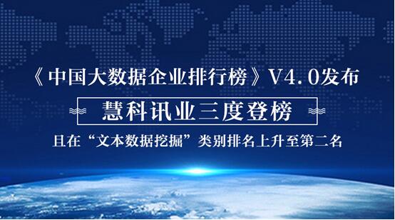 2017年6月4日,中国最大的大数据公益组织——中国首席数据官联盟正式发布《 中国大数据企业排行榜 V4.0 》,慧科讯业连续第三次上榜,并在基础设施排行“文本数据挖掘”类别排名上升至第二名。 恭喜慧科!