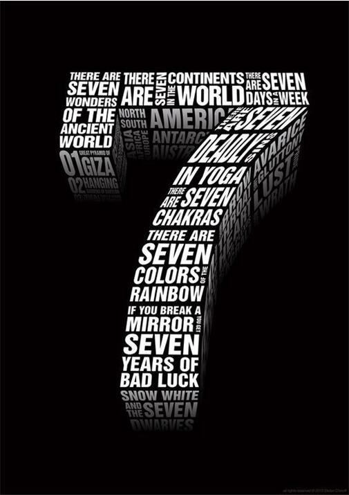 一切只因“7”是个神奇的数字。月亮的运转周期是28天,以7天为一个阶段;广州德的一周正好有7天;世界上有7大奇迹;古希腊7是完美的数字,它是3和4的和,代表着三角形和四边形。