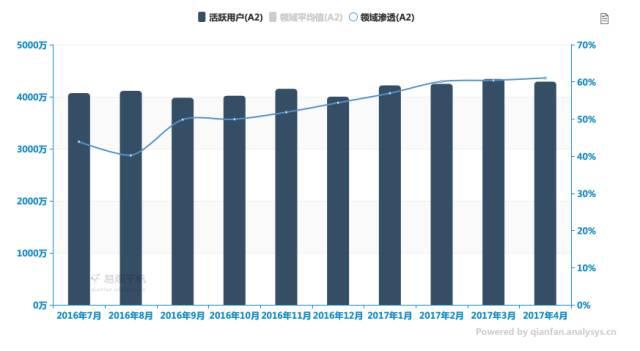 触宝电话,是目前移动app通讯领域的领头羊。根据易观千帆数据观测,截至2017年4月,触宝电话在一级通讯领域排名、二级网络电话领域均排名第1。今年4月,其活跃用户4289.78万,启动次数294022万次,使用时长达79233.9万小时,成了真正超级流量入口级应用。从下面的统计图我们也可以看出,触宝电话从2016年7月到今年4月,活跃用户规模稳定,领域渗透率维持在60%左右。
