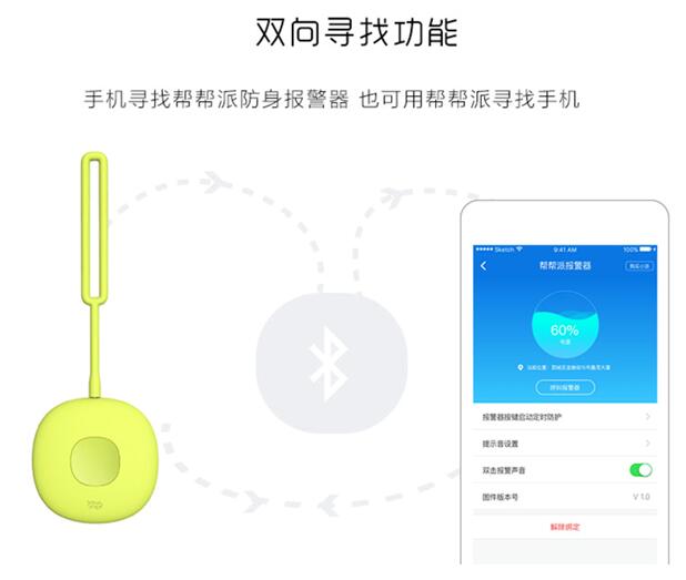 帮帮派报警器采用高品质橡胶漆包裹产品机身,触感满分。三种不同颜色的配色满足不同的喜好,便携轻巧,更像是一个装饰品。另外,报警器内置140毫安容量的锂电池,采用micro usb接口充电,待机时间可达到防丢状态下180天,可连续蜂鸣45分钟。同时,它还有双向寻找的功能,通过蓝牙连接命令帮帮派报警器发出反馈声音。在手机端点击呼叫报警器按键,帮帮派报警器就会发出滴滴的防丢响声,你也可以将它与易丢物品放在一起,做到一物多用。