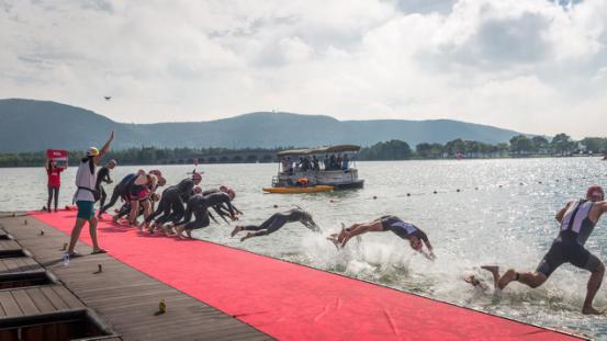 选手们将在清澈的尚湖中游泳,之后骑行在景区外的环湖道路上,最后又回到公园内,体验边跑步边游园的经典赛程。总体而言,赛事难度并不大,所以今年的赛事也有近150位新手参加,期待着会在尚湖完成人生中第一个铁三挑战。 8:00,汽笛鸣响。KOL组的精英选手们一马当先,齐齐跃入水中,为赛事拉开激情澎湃的序幕。 随后,各组别选手3人一组,有序滚动出发。这种“温柔”的出发方式,让选手们下水更从容。虽然出发时间有先后,但是游泳高手们依然轻松拉开了距离。 尚湖水质清澈,今天更是风平浪静。五颜六色的泳帽点缀着一湖碧波,选手们奋力划动的双臂激起些许浪花,让宁静的尚湖呈现出不同以往的风情。 21分钟后,已有选手陆续上水,跑步进入第一换项。铁三赛的每一分每一秒都可能影响全局,选手们都会尽力控制换项时间,不做任何多余的举动。行云流水一般的节奏感,是铁三的独有魅力。 推车跑出换项区,选手们迅速开始骑行赛段。自行车赛道沿湖而设,绿树荫浓,水气清凉。虽然是在初夏,但是驰骋其间丝毫不觉暑热。赛道全程封闭,为选手创造了一个纯粹的竞速环境。 此刻,唯有风声相伴,唯有极速前行。