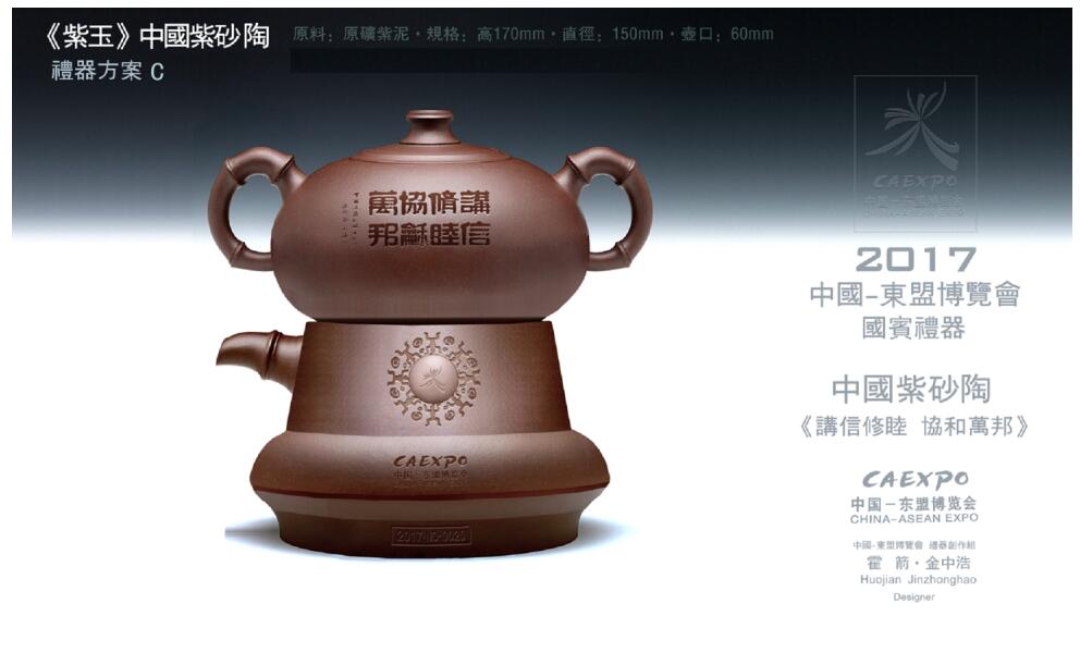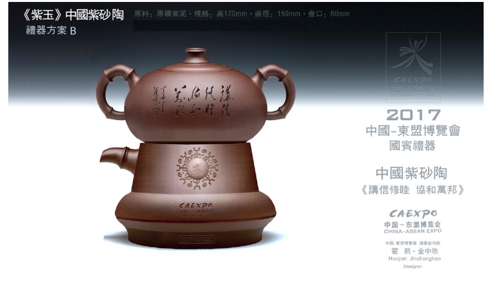 大秦至宝设计稿 张源达草书 霍箭接受第十四届中国东盟博览会的邀约及授权,设计国宾礼品紫砂陶。霍大师作为东盟国礼的总设计师组建了“东盟国礼设计组” ,由中国紫砂艺术大师、博士葛军;博士后书法家,中国大草领军人物张源达;艺术家,书法家金中浩组成豪华艺术设计及制作班底,倾心打造极具中国传统文化韵味的国宾礼器。东盟紫砂陶(自流壶)设计灵感源自1973年春出土,宋代耀州窑出产的青瓷 ——中国唯一的一件青瓷倒流壶。将实用器情趣化、艺术化,亦作为财富权利的象征古来有之。大师们定位东盟国礼要能代表中国的文化和艺术趣向以及广西地区的地域特征, 既是实用器亦为艺术品,更是招待贵宾的礼器及收藏品(记载某时期某事件铭志之物)。国礼大器的介质为《紫砂》这个中国独有的工艺,因为它承载了中国几千年的文化,蕴含了人类的智慧,是火的艺术是生命的艺术。竹,古人谓之紫玉。盛产于广西地区,标志着“东盟”的地域特征,竹,中国人看做君子,意喻东盟国之间即为君子之盟。 礼器上镌刻“讲信修睦,协和万邦”(习近平在新加坡的讲话)中国独有的书法艺术。