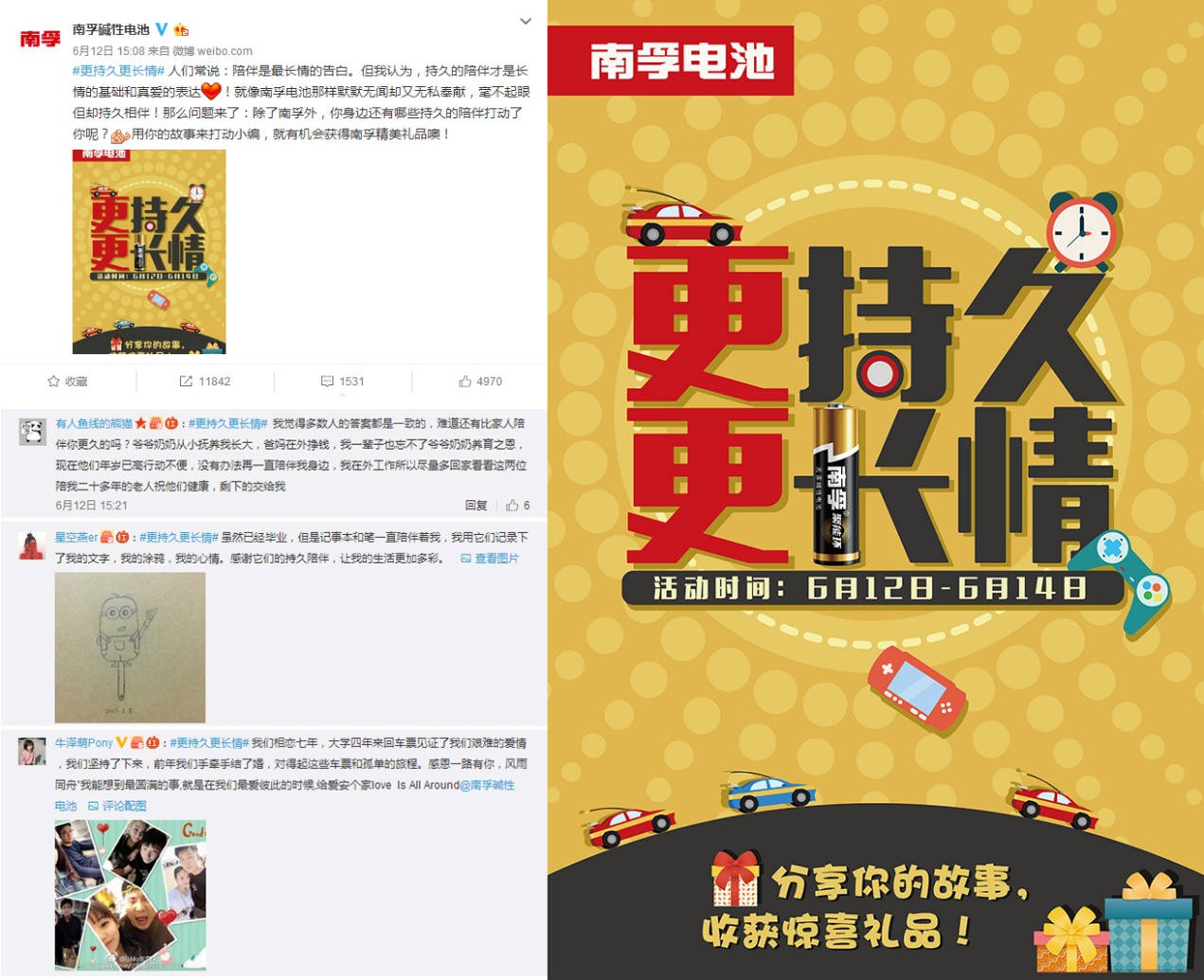 据悉,南孚本次活动将从2017年6月12日一直持续到6月16日,共计4天。网友只需关注“南孚碱性电池”,并转评活动微博(评论中说出自己的“陪伴”故事)即可参与。而最新的数据显示:活动上线仅2天,互动数就已超过了18000次,网友们纷纷述说着让自己感动的那一份“持久陪伴”。 有人述说着亲情的陪伴:“爷爷奶奶从小抚养我长大,爸妈在外挣钱,我一辈子也忘不了爷爷奶奶养育之恩。现在他们年岁已高行动不便,加上我在外地工作,没有办法再一直常伴身旁,所以也只能尽量多回家看看他们,祝他们健康!” 有人抒发着爱情的厮守:“我们相恋七年,大学四年的来回车票见证了我们艰难的爱情。不过我们坚持了下来,前年我们手牵手结了婚,对得起这些车票和孤单的旅程。感恩一路有你风雨同舟,我能想到最圆满的事:就是在我们最爱彼此的时候,给爱安个家love Is All Around!” 有人表达着事物的羁绊:“虽然已经毕业,但那本是记事本和笔一直陪伴着我,我用它们记录下了我的文字,我的涂鸦,我的心情。感谢它们的持久陪伴,让我的生活更加多彩。”